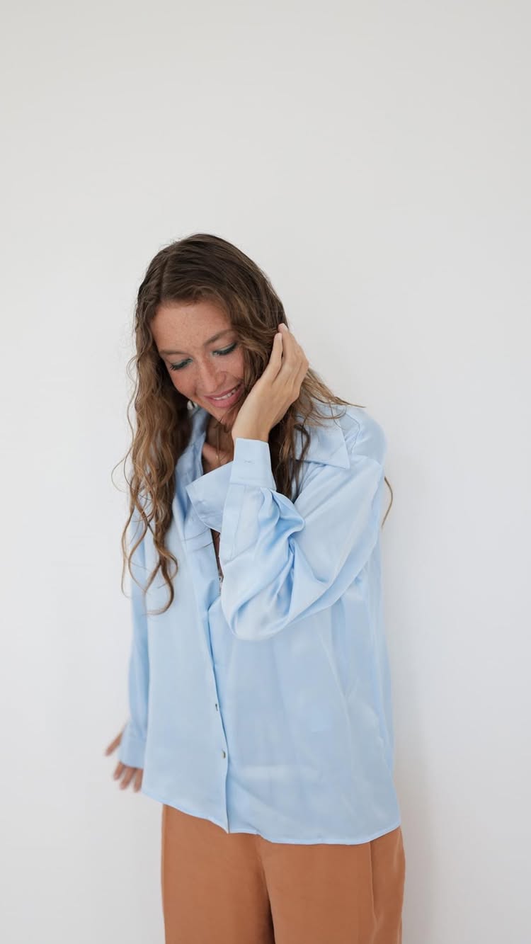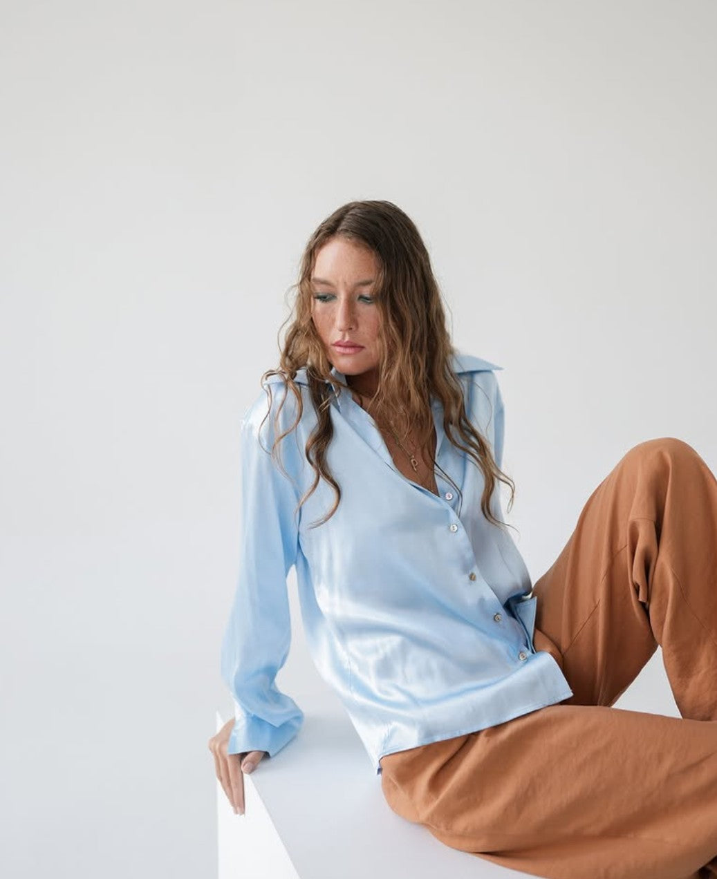 Natural silk shirt in sky blue. Light, clean, and airy — perfect for those who bring brightness and freedom to minimalism. -- SKU: 10-SHRT-SLK-43-05