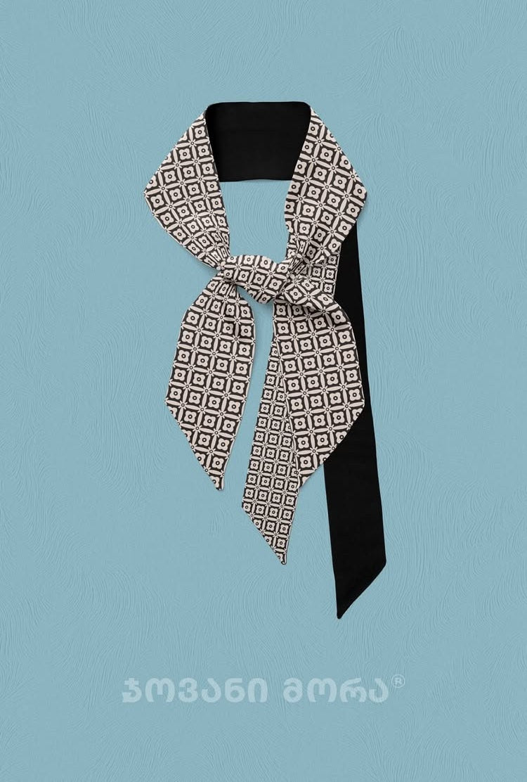 ყელის შარფი, დამზადებული ნატურალური აბრეშუმისგან, „დილის ვარსკვლავის“ პრინტით. ელეგანტური შავი ტონის აქსესუარი, რომელიც თქვენს იმიჯს სიღრმეს და სიმშვიდეს სძენს. -- ორნამენტი დაფუძნებულია ერისთავთ-ერისთავის და მანდატურთუხუცესის, გიორგი II დადიანის, ტანსაცმლის მოტივზე, რომელიც ხობის ღვთისმშობლის მიძინების ეკლესიის ფრესკაზეა ნაჩვენები. მე-14 საუკუნე. ეს პროდუქტი შეიქმნა „ქართული ტექსტილის“ პროექტის ფარგლებში — TBC-სა და ხელოვნების სასახლის თანამშრომლობის შედეგად. - SKU: 10-NECK-SLK-01-01