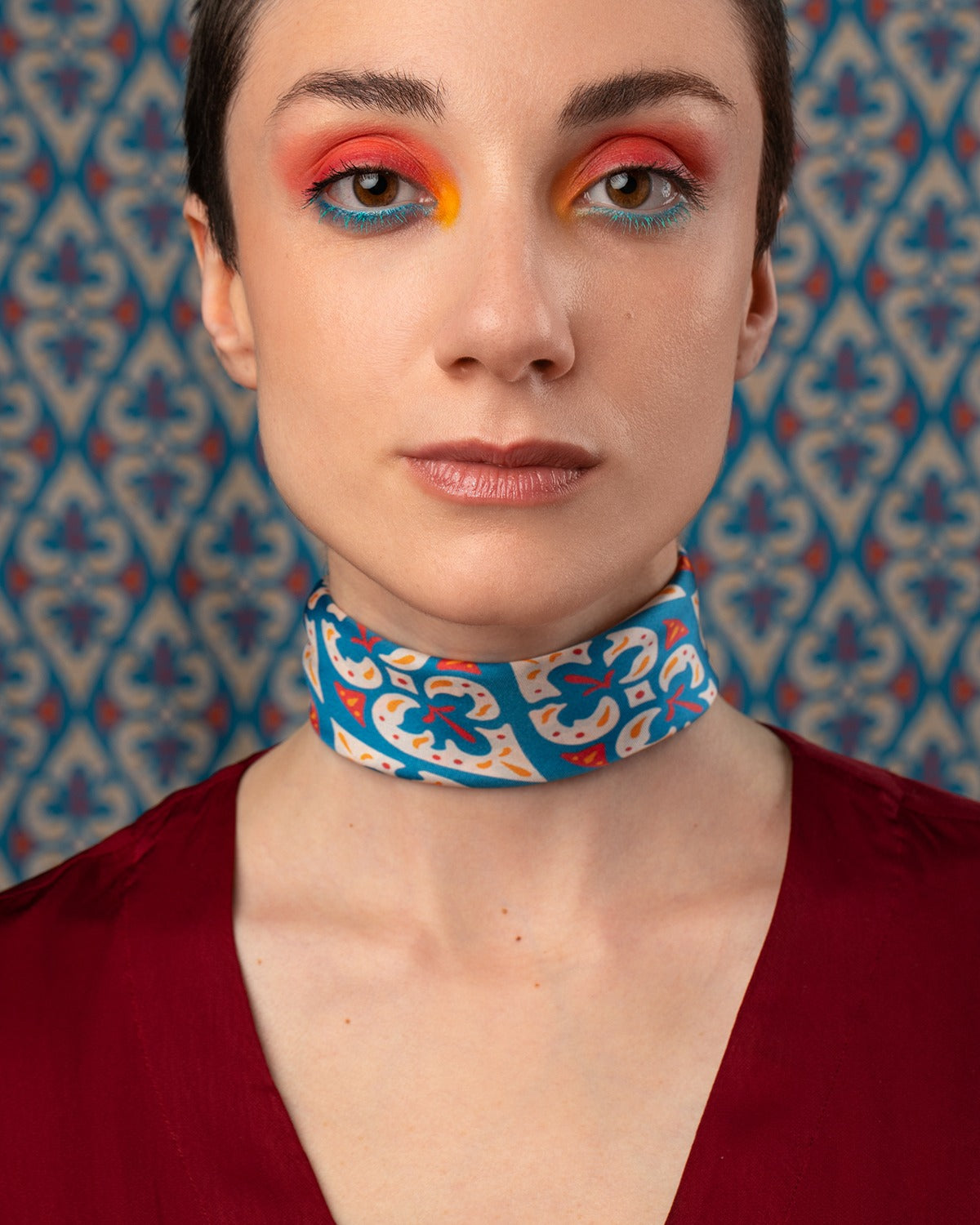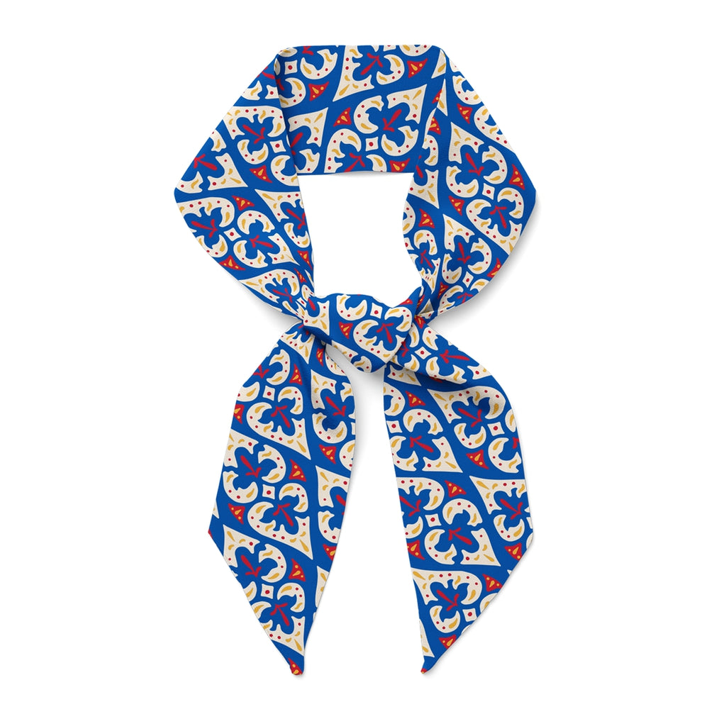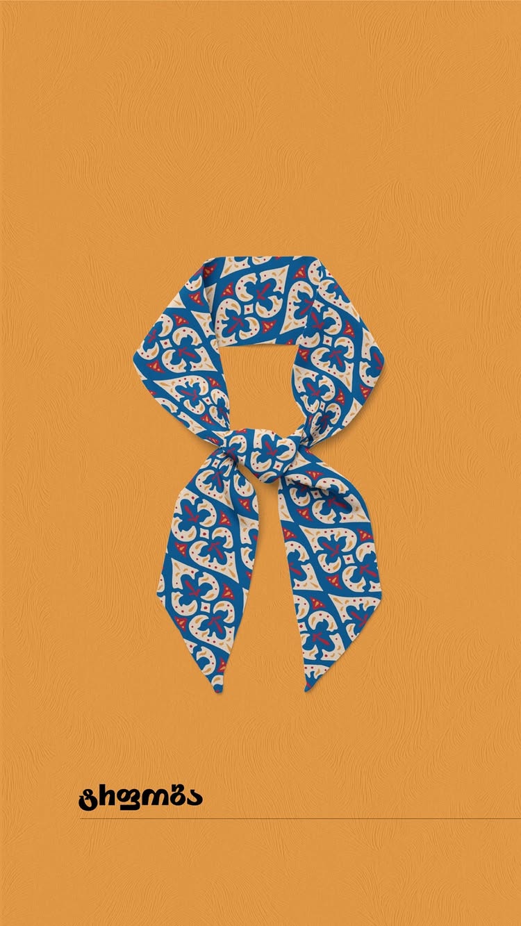 ყელის შარფი, დამზადებული ნატურალური აბრეშუმისგან, „ტრფობის“ პრინტით. ჰაეროვანი და დახვეწილი ლურჯი ტონებით — მშვიდი და გემოვნებიანი სტილისთვის. -- ორნამენტი დაფუძნებულია მეფე გიორგი II-ის ბიზონების მუხის რკოს ნაქარგობის მოტივზე, რომელიც გამოსახულია გელათის მთავარ ეკლესიაში. მე-16 საუკუნე. ეს პროდუქტი შეიქმნა „ქართული ტექსტილის“ პროექტის ფარგლებში — TBC-სა და ხელოვნების სასახლის თანამშრომლობის შედეგად. -- კოდი: 10-NECK-SLK-04-06